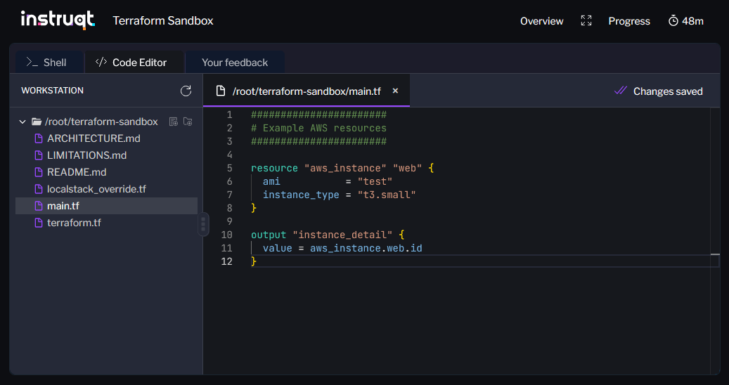 Sandbox sessions run for a limited time (up to one hour), which is generally enough for hands-on experiments, tutorials, or simple configuration testing. Because the environment is pre-configured, there is no need to worry about installing dependencies or setting up paths. This makes the Terraform Sandbox particularly well suited for beginners or for users on restricted machines.
