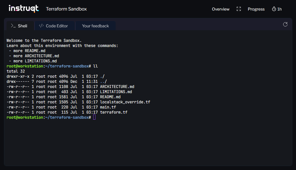 Once you launch a sandbox session, you're presented with a terminal interface in your browser. Terraform is preinstalled in the sandbox, along with key supporting tools such as Docker, LocalStack (AWS simulator), Code Editor, and the AWS CLI.
